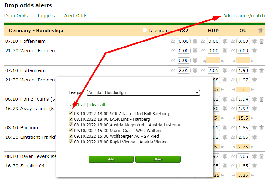 Добавить матч в данный раздел можно с подраздела Drop Odds и Triggers