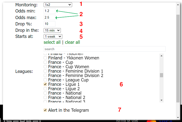 После оплаты тарифного плана Dro Odds пользователь может менять параметры (фильтры).