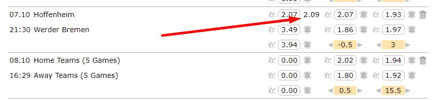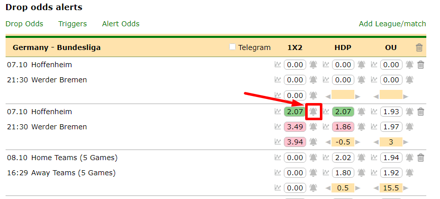 Например, пользователь загрузил матчи чемпионата Германии и задача: получить оповещение в Телеграм-бот если коэффициент на победу команды Hoffenheim достигнет значения 2.09