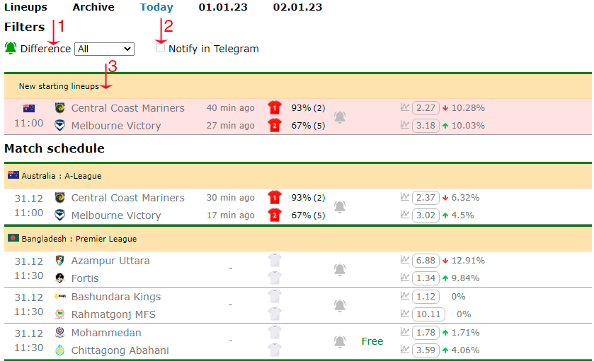 3 - New starting Lineups section. This section is located at the very top of the table where the current starting lineups of the teams appear (from top to bottom according to the time of the appearance of the starting lineups). To display ALL new starting lineups in the section New starting Lineups it is necessary to activate the Difference filter (select the All function). Also, the user can choose the necessary difference between the starting lineups of the teams.