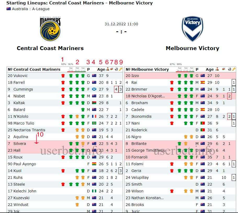 4 - The number in parentheses indicates the number of players who are not in the current starting lineup in relation to the previous game. In the team table, these players are marked in red.