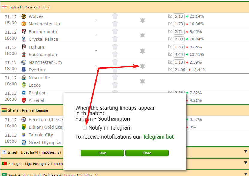 To activate the notification about the exit of the starting lineups for individual matches, the user needs to click on the bell and activate the notification in the Telegram bot: