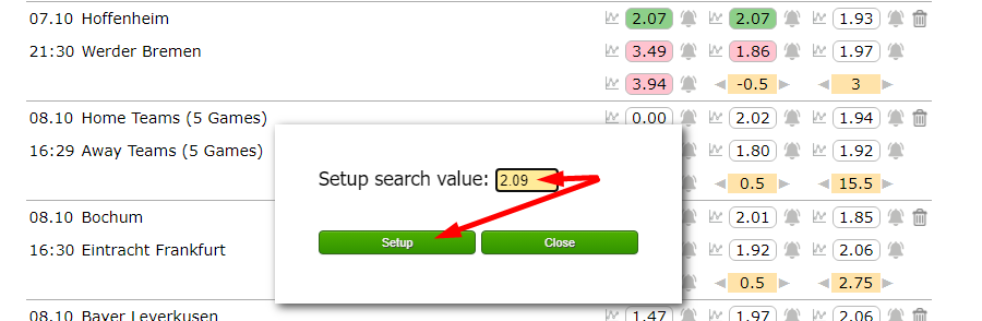 Например, пользователь загрузил матчи чемпионата Германии и задача: получить оповещение в Телеграм-бот если коэффициент на победу команды Hoffenheim достигнет значения 2.09