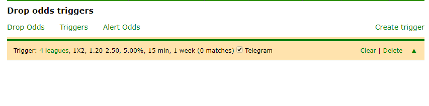 Например, стоит задача получить сигнал в Телеграм-бот при изменении коэффициента более чем на 5% в 4 ТОП лигах короткий промежуток времени (15 минут). Для этого пользователь создает триггер в подразделе Triggers кликнув на "Create trigger"