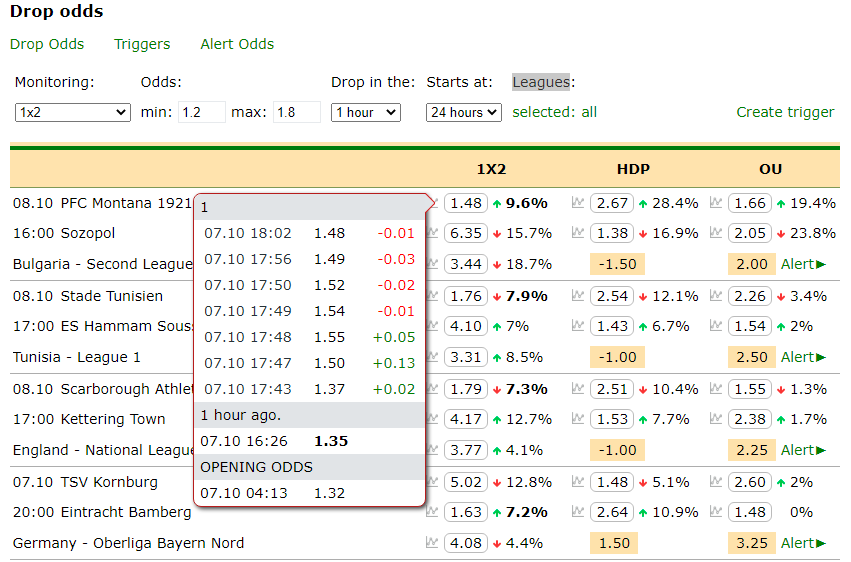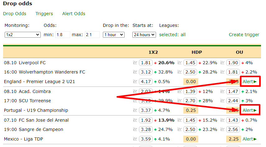 Добавить матч в данный раздел можно с подраздела Drop Odds и Triggers